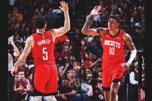 赛后,火箭官方晒出赢球海报,小贾巴里-史密斯和范弗里特登上封面。